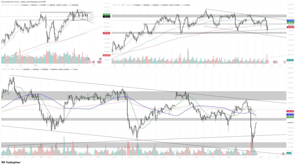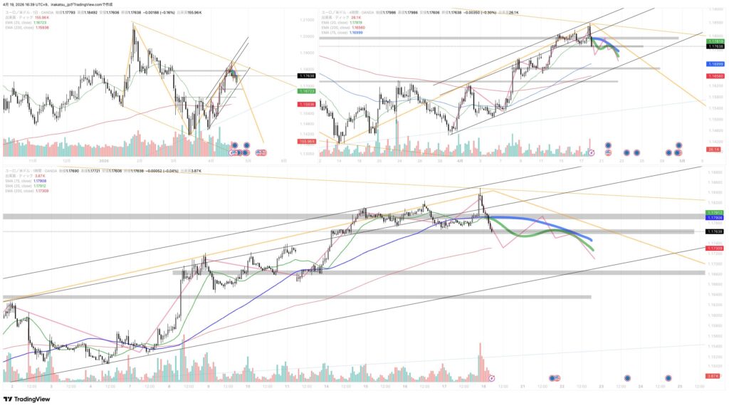 4時間足レベルで若干下げてるようにも見えるけど、