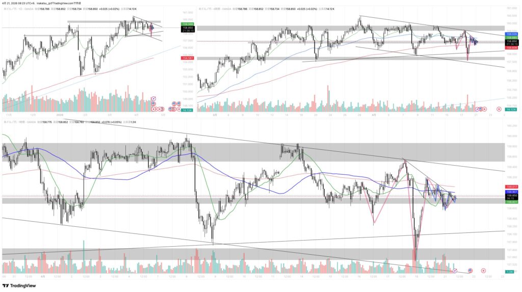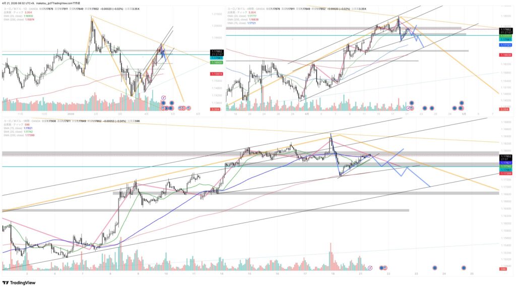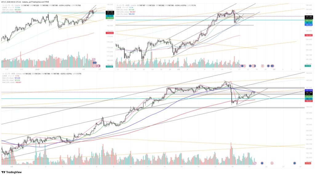 4時間足でレンジなのでどちらかにはっきりと抜けてから。