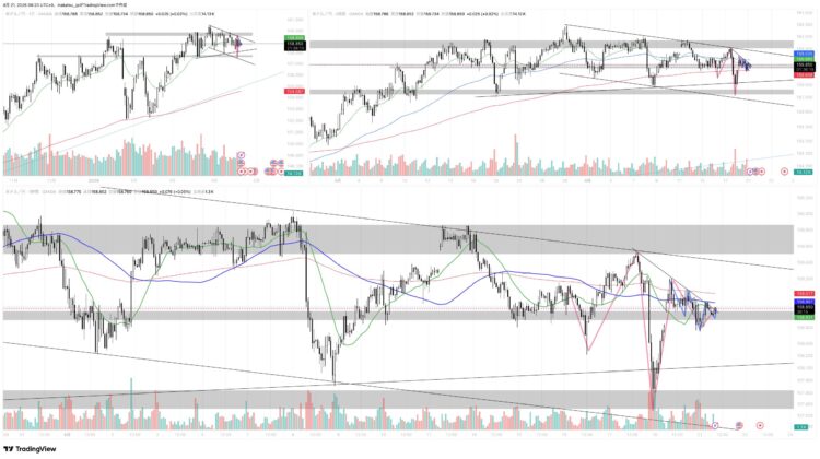 現在、1時間足レベルで、逆三尊の逆三尊に見えるので、ネックライン超えで買いたくなるけど、移動平均線がキレイじゃないので我慢かな、、
