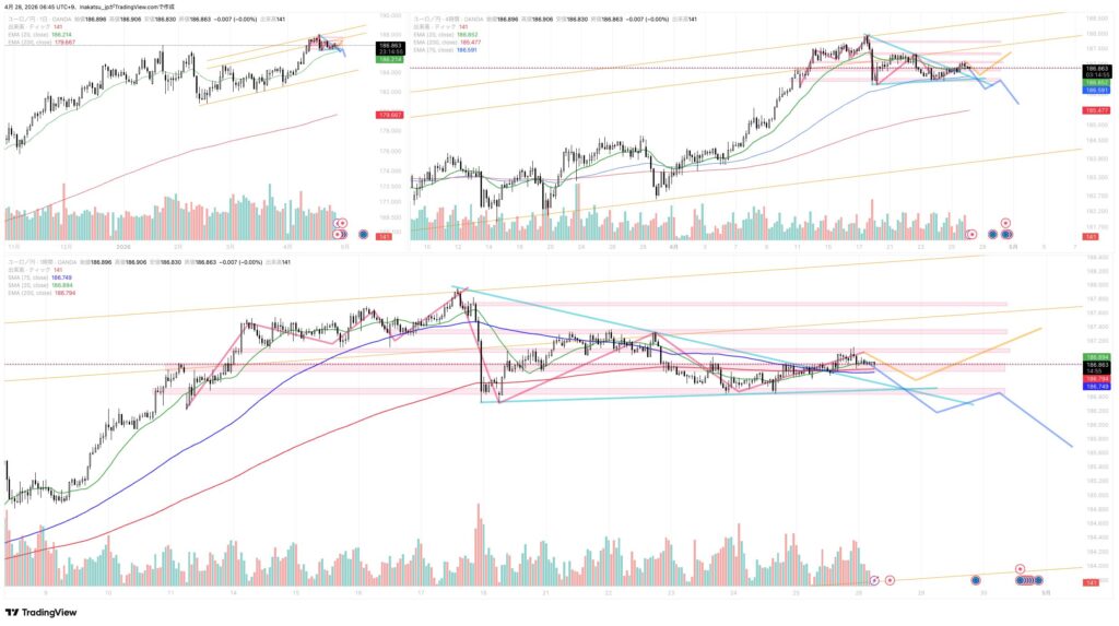 4H足:上目線。3分の1戻しくらいで反発。波がジグザグしてて荒れ気味。