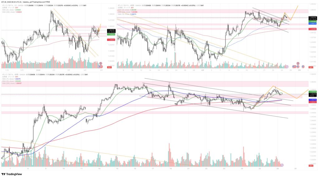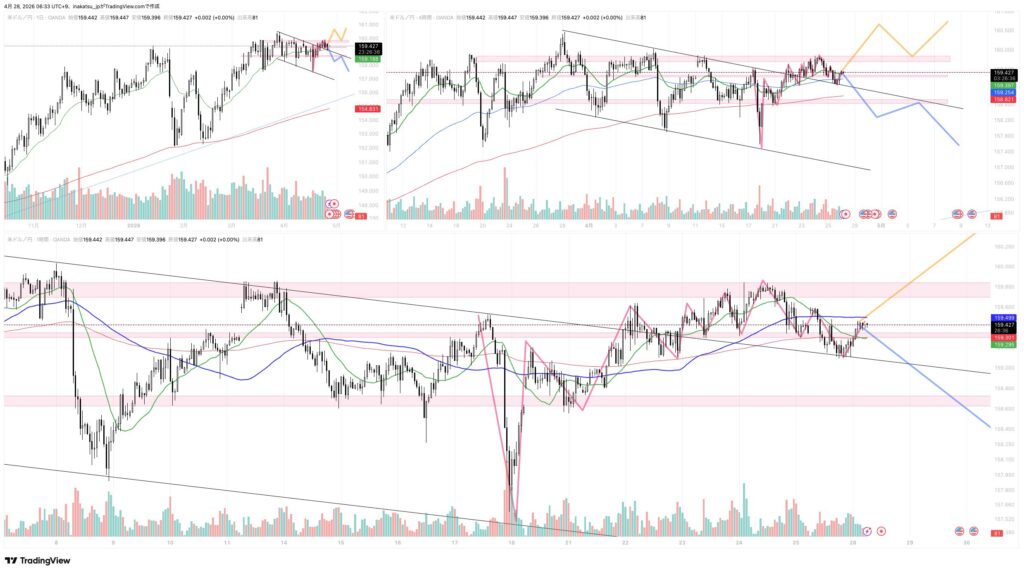 1、(黄)4H足の3波狙い。1H足でいい感じの状況になれば買っていきたい。ユロドルも見ながら良さげな方を買っていきたい。