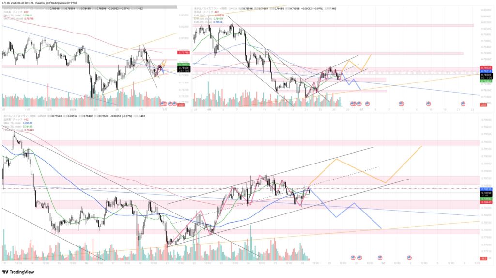 1、(黄)4H足の3波狙い。1H足でいい感じの状況になれば買っていきたい。