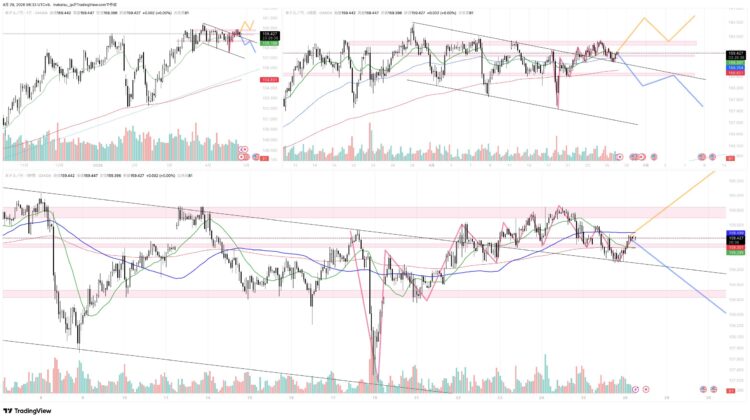 4H足:やや上目線(微妙)。直近安値を割ったけど下降トレンドラインで反発している。波が短期間でジグザグしてる。